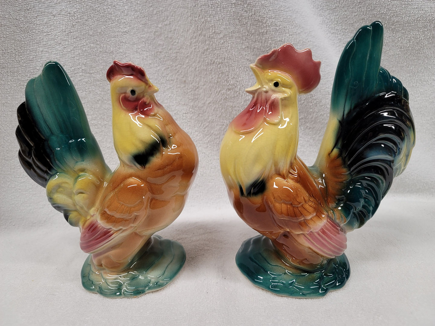 A collection of chicken figurines and chicken feed coin banks produced across all three Spaulding China labels — Royal Copley, Royal Windsor, and Spaulding. These playful barnyard pieces come in a range of sizes and colorways.