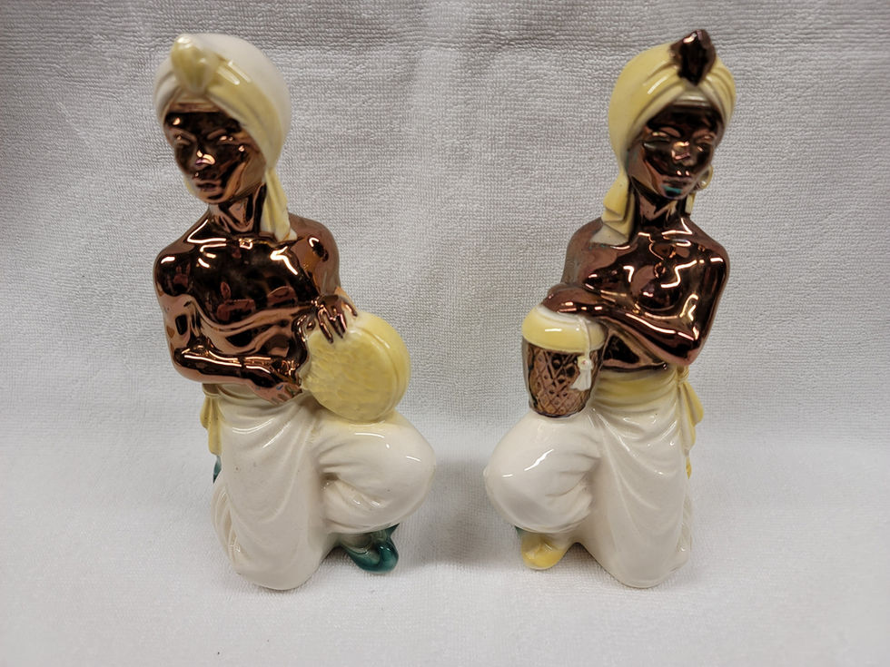A collection of Royal Copley figurines and planters depicting people from various cultural backgrounds. Produced in many color combinations, these pieces represent the diverse human subjects created by Spaulding China during the mid-20th century.
